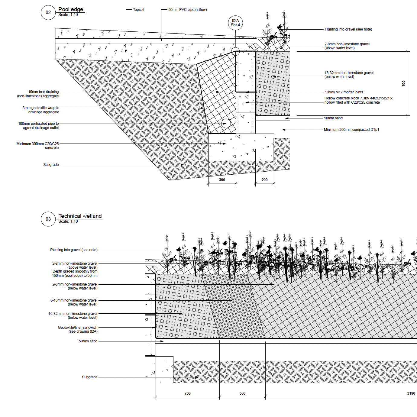 Detailed design plans, at a more granular scale, from which a landscape contractor can cost, set out, and build the garden. These will include technical construction drawings of specific features, setting out plans, and detailed specifications.